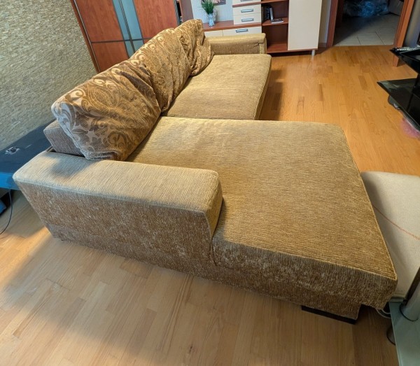 Угловой диван, длина 250 см, б/у, с подушками, В левом подлокотнике имеются открытые полочки, а также выдвижные, очень удобно. В одном месте на диване есть небольшое вздутие.